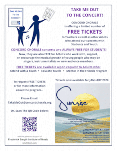 TAKE ME OUT TO THE CONCERT… We are able to offer a limited number of FREE TICKETS to Adults, enabling them to accompany Students to a live concert, creating a memorable experience of choral music.